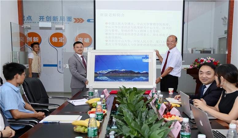 接下来,由天弈咨询公司首席专家谢康教授讲话。为表达对谢康教授的敬意与谢意,林总特挑选了一副他最中意的拍摄作品赠与谢康老师。